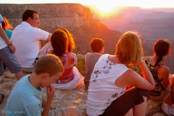 Wieder zurück im Park fahren wir am Abend dann noch einmal zum Yavapai Point, um den Sonnenuntergang zu beobachten. Offenbar sind wir nicht die einzigen mit dieser Idee — denn es haben sich etliche Leute hier versammelt.