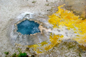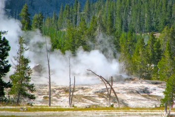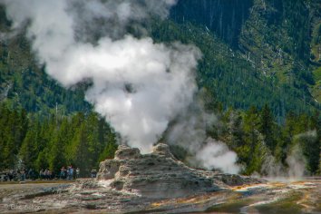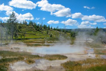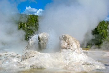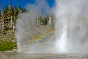 Jeder ist irgendwie einzigartig. Manche haben sehr kurze Eruptionsphasen, wie z.B. der Anemone Geyser, wo man alle 7-10 Minuten sämtliche Stadien des Ausbruchs beobachten kann: Erst füllt sich der Pool lautlos, läuft dann über und große Blasen blubbern, bis plötzlich das Wasser bis zu drei Metern hoch herausschießt, um schließlich mit einem Gurgeln wieder im Erdinnern zu verschwinden.