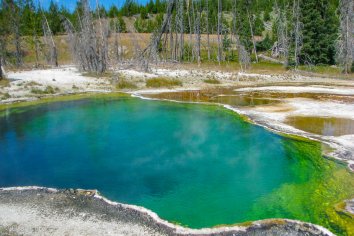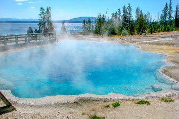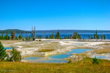 Heute heißt es nun Abschied nehmen vom Yellowstone Park — die großen Tetonen warten auf uns. Ein letztes Mal kommen wir auf unserer Weiterfahrt an einem Geysirbecken vorbei: dem West Thumb.