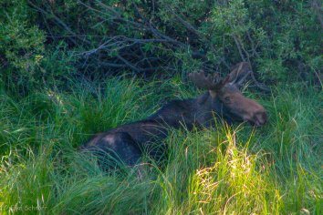 Wir fahren am Ufer des Jackson Lake entlang und sehen kurz vor der Jackson Lodge am Straßenrand einen jungen Elchbullen, der sich in den kühlen Schatten zurückgezogen hat und ein Nickerchen hält.