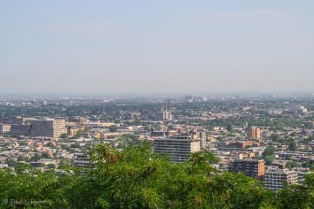 Am Parklatz in der Voie Camilien-Houde lassen wir das Auto stehen und laufen den Rundweg zum Chalet du Mont-Royal. Von hier hat man eine tolle Aussicht über Montréal. Bei klarem Wetter soll man bis zu den Adirondacks — unserem nächsten Reiseziel — sehen können, heute ist es aber leider ziemlich diesig.