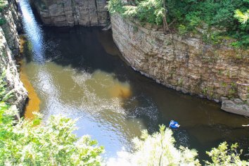 Gegen Mittag machen wir unseren ersten Zwischenstopp bei der Ausable Chasm. Hier zwängt sich der Ausable River durch eine spektakuläre, teilweise bis zu 60 Meter tiefe Klamm und wir laufen den zwei Meilen langen Trail entlang des Rim.