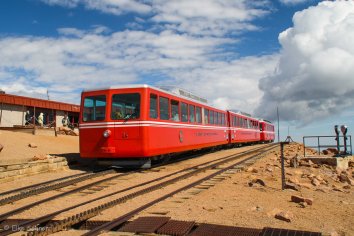 Oben angekommen stellen wir fest, dass es zum einen sehr kalt und windig ist (es hat nur knapp über 0°C) und zum anderen die Luft wirklich sehr dünn ist. So halten wir uns nicht sehr lange auf — schießen nur das obligatorische Gipfelfoto (der persönliche Höhenrekord will schließlich dokumentiert sein) und schauen uns die Zahnradbahn von der Pikes Peak Cog Railway an — eine alternative Möglichkeit, um auf den Berg zu gelangen.