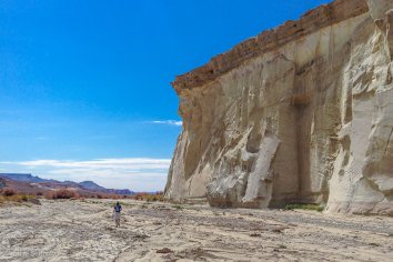 Nach 60 Minuten Geholper erreichen wir den Parkplatz und stellen unser Auto ab. Wir laufen den breiten Wahweap Creak entlang und sehen schon bald die weißen Felsnadeln mit den dunklen Steinhüten.