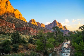 Wir fahren mit dem Shuttle zur Canyon Junction und laufen auf dem Pa’rus Trail zurück zum Campground. Kein spektakulärer Weg — sehr einfach aber ganz nett — immer entlang des Virgin River, den man unterwegs immer wieder über mehrere Brücken überquert und gerade gut als Verdauungsspaziergang geeignet.
