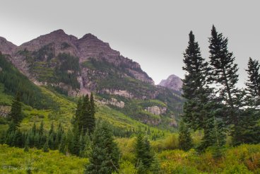Als wir oben bei den Maroon Bells ankommen, ist leider kein besonders schönes Wetter. Es ist ziemlich bewölkt und ab und zu fallen ein paar vereinzelte Tropfen vom Himmel.