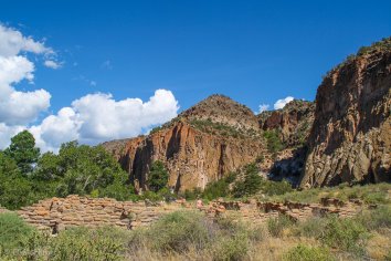 Der Frijoles Canyon wurde über die Jahrtausende vom Wasser in das Tuffplateau geschnitten und war zwischen 1100 und 1550 von Vorläufern der Pueblo-Kultur besiedelt. Im Gebiet sind über 1000 Siedlungsorte nachweisbar, im größten Tyuoyi Pueblo kann man das Gemeinschaftshaus und die Zeremonienhöhle sehen.