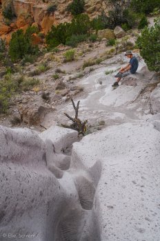 Über eine Leiter gelangt man hinauf auf die Mesa, von wo man einen guten Ausblick auf die Umgebung hat. Dann folgen wir einem Weg, der sich im Laufe der Jahre regelrecht in den weichen Tuffstein eingegraben hat. Wir laufen quasi in den Fußstapfen der Indianer…