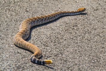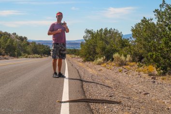 Kurz nach dem Passieren des Parkeingangs-Häuschens tritt Andreas ganz plötzlich scharf auf die Bremse. Erst wundern wir uns nur — aber dann sehen wir sie auch: eine riesige RattleSnake liegt mitten auf der Straße und rührt sich nicht.