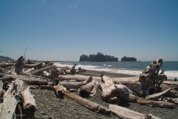 Der Rialto Beach ist vom Parkplatz aus recht leicht zugänglich und gefällt uns richtig gut: von der Witterung ausgebleichtes Treibholz, aus dem Wasser ragende Felstürme und ein strahlend blauer Himmel geben eine perfekte Kombination ab.