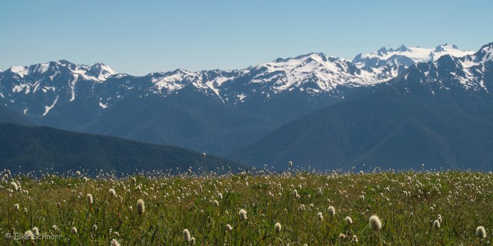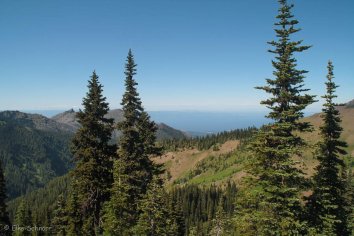 Die Straße schlängelt sich in endlosen Serpentinen in die Höhe und oben angekommen, bietet sich uns ein phantastischer Blick auf die schneebedeckten Gipfel des Olympic NP.