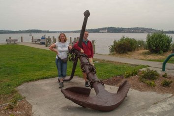Am Alki Point verdirbt uns leider ein fettes Containerschiff die Sicht auf die Skyline. Aber da es heute morgen eh recht trüb ist, wären die Fotos auch sonst nicht so dolle geworden.