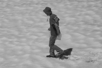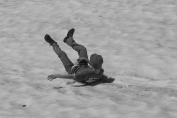 Auf der zweiten Hälfte des Trails müssen wir viele Schneefelder überqueren — Christi macht das auf seine eigene, unkonventionelle Art: rutschenderweise mit einer Einkaufstüte