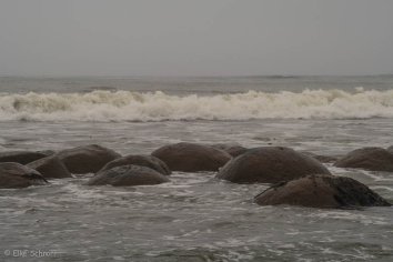 So treffen wir schon gegen 9:00 Uhr am Trailhead zum Bowling Ball Beach ein. Über eine steile und wackelige Holztreppe klettern wir nach unten zum Beach und laufen dann einen knappen Kilometer am Strand entlang, um zu den Bowling Balls zu gelangen. Diese sind aber leider schon zum großen Teil unter Wasser, denn unser Timing bzgl. Ebbe und Flut ist hier nicht so optimal.