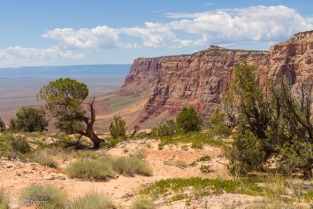 Wir laufen noch ganz nach vorn bis zum Rim — trotz relativ trüber Sicht können wir bis zu den letzten Ausläufern des Grand Canyon schauen.