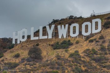 Kurz vor dem Gipfel teilt sich die Straße. Wir laufen zunächst weiter nach oben, wo der Weg unmittelbar hinter den 15 Meter großen Lettern des berühmten Schriftzuges endet. Ganz heran kommt man allerdings nicht an die Buchstaben: sie sind eingezäunt und werden durch Kameras und Zugangskontrollen überwacht, die automatisch die Polizei informieren.