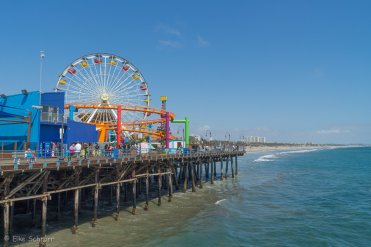 Wir parken unser Auto in Venice am Beach und laufen entlang des Ocean Front Walk bis zum Santa Monica Pier. Auf der betriebsamen Strandpromenade sorgen neben vielen Restaurants und bunten Verkaufsständen auch Skateboard-Artisten, Pflastermaler, Pantomimen und Musikanten für Unterhaltung.