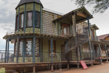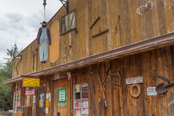 Diese haben wir zwar 2012 schon einmal besucht, aber damals war es so heiß, dass wir uns kaum draußen aufhalten konnten und schon nach wenigen Minuten in den Saloon flüchten mussten. Dieses Mal ist es deutlich angenehmer. Wir sind die einzigen Besucher und können uns in aller Ruhe umschauen. Das ist der Vorteil der frühen Stunde — andererseits gibt zu dieser Zeit natürlich weder Shows, noch Touren. Die Minentour wäre sicher ganz interessant gewesen.