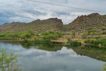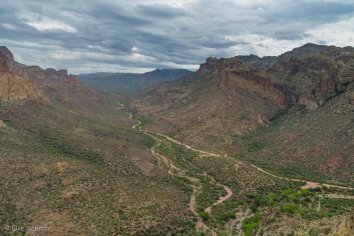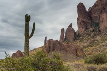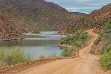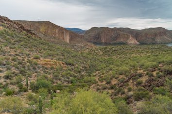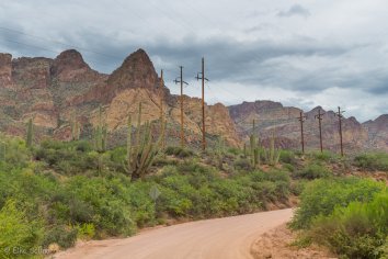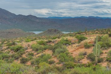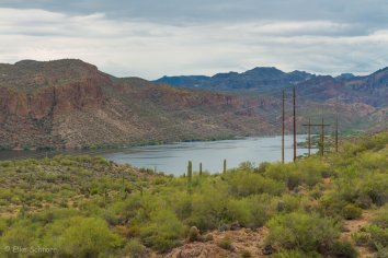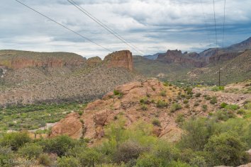 Gegen 11:00 Uhr begeben wir uns auf die Weiterfahrt entlang des Apache Trails. Dieser erhielt seinen Namen übrigens, weil die Straße einem alten Pfad folgt, den die Apache Indianer durch die Superstition Mountains nutzten. Anfang des 20. Jahrhunderts wurde die Strecke für den Bau des Theodore Roosevelt Dams als Versorgungsstraße ausgebaut — heute wird sie hauptsächlich touristisch genutzt, denn der Apache Trail führt durch eine traumhafte Landschaft: Herrliche Kakteen umrahmt von prächtigen Felsen, Canyons und Mesas, dazu die Ausblicke auf den Canyon Lake und den Apache Lake. Eine perfekte Mischung aus Wasser und Wüste, die uns alle paar Meilen zum Anhalten nötigt, um wieder ein paar Fotos zu machen.