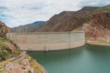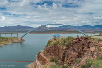Wir benötigen für die 43 Meilen fast drei Stunden und kommen gegen 14:00 Uhr schließlich am Roosevelt Dam an. Ursprünglich im Jahre 1911 fertig gestellt, wurde er Ende des 20. Jahrhunderts erneuert und ausgebaut, als man feststelle, das der größtmögliche Wasserstand im Reservoir doch deutlich höher ist als man ursprünglich angenommen hatte.