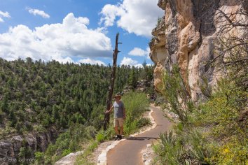 Der von alten verwachsenen Bäumen gesäumte Pfad führt über etliche Stufen steil in den Canyon hinunter. Man hat dabei immer wieder wunderbare Ausblicke und kann die alten Felsenwohnungen — bzw. was davon noch erhalten ist — anschauen. Archäologisch wirklich sehr interessant.