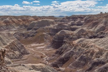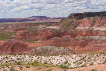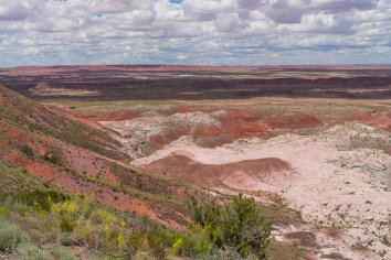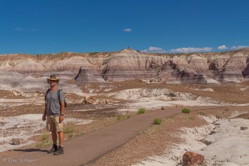 Bei der Fahrt auf der Parkstraße kommen wir im nördlichen Teil zunächst am Painted Desert vorbei, wo die Erosion eine farbenfrohe Landschaft gestaltet hat. Wir schnüren unsere Wanderschuhe und laufen auf dem Rim-Trail entlang. Hier bieten sich tolle Ausblicke auf die rotbraunen Badlands, die sich bis zum Horizont erstrecken. Eine bunte Welt, die ihresgleichen sucht…