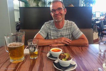 Im Hotel machen wir uns etwas frisch und spülen den ganzen Sand ab. Dann geht es zum Abendessen in die Vernal Brewing Company. Obwohl einige Tische leer stehen, müssen wir 20 Minuten warten — das Personal ist wohl gerade etwas überfordert…