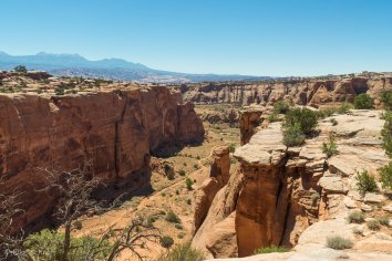 Als wir an einem kleinem Parkplatz vorbeikommen, treffen wir einen Mann, der mit seinen Kindern zu einer Jeeptour unterwegs ist und befragen auch ihn nach dem Straßenzustand auf der weiteren Strecke. Er beruhigt uns, dass wir das schlimmste Stück hinter uns hätten und zeigt uns auch noch, wie wir von hier aus direkt zum Gemini Bridges Overlook und zu den Bridges selbst laufen können.