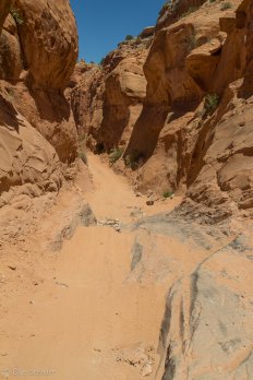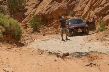 Kurz nachdem wir von der 191 in die Gemini Bridges Road abgebogen sind, kommt uns jedoch ein SUV rückwärts fahrend entgegen. Das scheint wohl nichts Gutes zu verheißen… Aber wir bleiben noch optimistisch — vermutlich wird das einfach ein Weichei sein