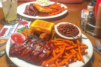 Die Restaurant-Entscheidung erweist sich als goldrichtig. Sowohl Andreas’ Ribs als auch mein Brisket mit den Süßkartoffel-Pommes sind butterzart und saulecker.
