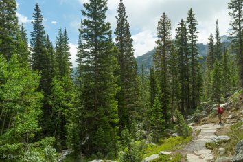 Nach einer kurzen Pause geht es weiter zum Haiyaha Lake. Nach der Abbiegung wird es auf dem Wanderweg deutlich ausgedünnter und uns kommen zumindest keine Vertreter der Badeschlappen-Fraktion mehr entgegen