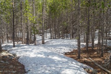 Der Weg führt größtenteils durch den Wald, ist sehr steinig und es geht stetig bergauf. Ab und zu müssen wir ein kleines Schneefeld überqueren und wir kommen an vielen kleinen Seen vorbei — sehr idyllisch, aber Mückenspray sollte man auf jeden Fall im Gepäck haben.