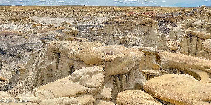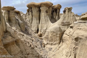 Wir machen eine kurze Mittagspause, essen unsere Brote und fahren dann weiter zum zweiten Punkt auf der Tagesordnung: dem Valley of Dreams. Nachdem wir hier ja vor einigen Jahren schon die Bistis und gestern die Ah-Shi-Sle-Pah Wilderness erforscht haben, sind wir gespannt, was die Natur in dieser abgelegenen Region noch so an skurrilen Gebilden hervorgebracht hat.