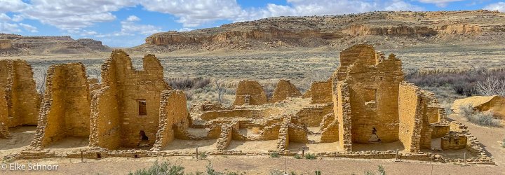 Nach dem Schnüren der Wanderstiefel und dem Füllen der Trinkblasen geht es dann direkt los. Wir kommen am Anfang an Teilen des Pueblo Bonito vorbei, die wir aber noch nicht so genau unter die Lupe nehmen - schließlich gibt es ja dann am Nachmittag die Führung. Aber ein paar erste Blicke riskieren wir doch: