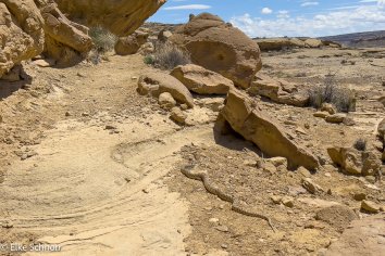 Als wir schon wieder auf dem Rückweg sind, bemerke ich aus dem Augenwinkel auf einmal eine schnelle Bewegung am Boden und tatsächlich schlängelt sich doch da eine Schlange am Weg entlang. Wir sind uns nicht sicher, ob diese Art gefährlich ist und gehen deshalb lieber einen kleinen Umweg, um ihr nicht zu nahe zu kommen. Später erklärt uns ein Ranger allerdings, dass es sich um eine harmlose Bull Snake gehandelt hat.