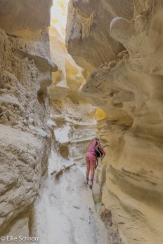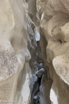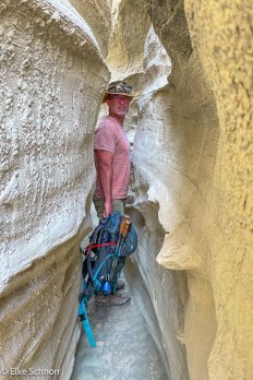 Irgendwann rücken die Canyonwände immer näher zusammen und es wird enger und enger. Wir müssen seitlich laufen, den Rucksack über dem Kopf tragen und den Bauch einziehen, um überhaupt irgendwie langsam und mühsam voranzukommen. Immer wenn wir eine Engstelle überwunden haben und wieder etwas Luft bekommen, denken wir, jetzt haben wir es geschafft — nur um dann an der nächsten Biegung mit der nächsten Engstelle konfrontiert zu werden.