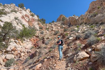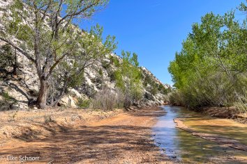 Gegen 10:00 Uhr Utah-Zeit sind wir am Trailhead. Keine Menschenseele weit und breit zu sehen. Wir packen ein paar Getränke ein und machen uns auf den bereits bekannten Weg. Am Anfang müssen wir uns wieder durch dickes Gestrüpp kämpfen und den Cottonwood Creek queren, dann folgt der harte Anstieg.