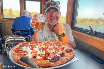 Am späteren Abend gehen wir dann zum Outfitter essen. Die Pizzas hier sind riesig, weshalb wir versuchen uns eine große zu teilen. Aber selbst das schaffen wir nicht und lassen uns die Reste einpacken als Lunch für morgen.