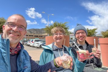 Wir genießen ausgiebig die gemeinsame Familienzeit, backen zusammen Croissants, erzählen viel, spielen und machen einen ausgiebigen Spaziergang durch Boulder. Eis schmeckt übrigens auch bei frostigen Temperaturen…
