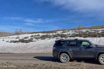 Und dann ist es erstmal kurz vorbei mit dem Grün, denn als wir uns auf die Pässe vor Torrey hinauf schrauben, werden wir von Schneefeldern eingeholt. Krass — gestern hatten wir noch über 25 Grad und jetzt fühlen wir uns wieder wie mitten im Winter