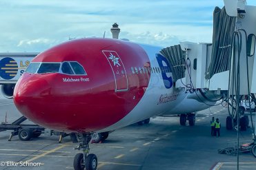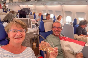 Unser Flug mit Edelweiß startet leicht verspätet, dafür werden wir unterwegs von einem äußerst zuvorkommenden Personal verwöhnt. Das Essen ist ausgezeichnet, allerdings fühle ich mich uralt, da mich der Steward ständig mit „Gnädige Frau“ anspricht