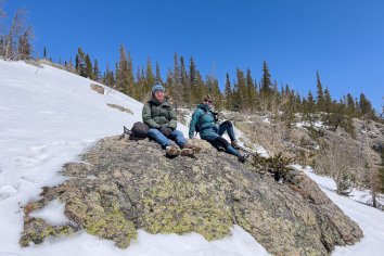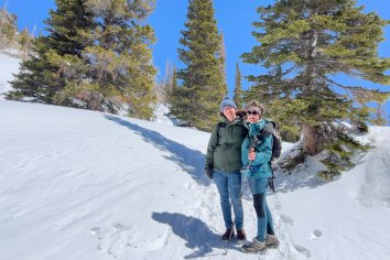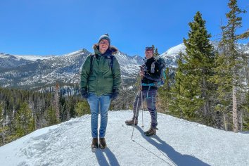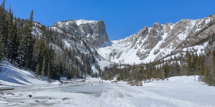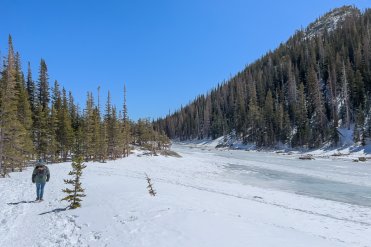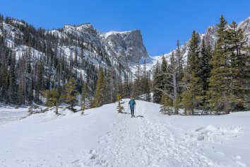 Der Parkplatz am Bear Lake ist noch erstaunlich leer — aber uns soll es recht sein. Wir schnüren unsere Wanderschuhe, packen vorsorglich die Spikes ein und brechen dann auf zu einer Winterwanderung durch die verschneite Landschaft.