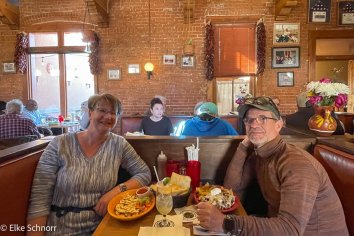 Stattdessen telefonieren wir eine Runde mit zu Hause und gehen um 7:30 Uhr zum Frühstücken in’s Palacio Café. Hier genehmigen wir uns in Aussicht auf die ordentliche Wanderung, die für heute geplant ist, ein ebenso ordentliches Frühstück in Form von Huevos Rancheros — sehr lecker und sehr reichlich: