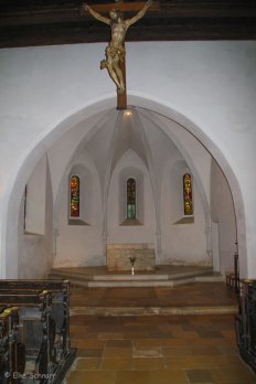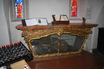 Unter einer Empore steht der Sarkophag des Heiligen Vitalis, eines Märtyrers aus den Römischen Katakomben.