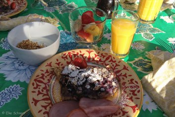 Das Frühstück gibt es in der benachbarten Hacienda Nicholas. Jeden Tag gibt es ein wechselndes warmes Gericht und dazu selbsgemachte Kuchen, Obst, Cereals, Toast usw. von einem Buffet. Es war alles sehr lecker und wir haben sogar ein neues Rezept mit nach Hause genommen.