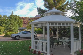 Im Hof gibt es mit dem Pavillon einen schönen schattigen Platz zum Entspannen.