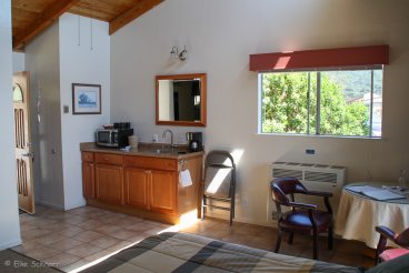 Wir hatten ein reichlich großes Zimmer mit 2 Doppelbetten und einer kleinen Küchenzeile. Kühlschrank und Mikro waren vorhanden - Geschirr (außer Weingläsern) muss man jedoch selbst mitbringen, wenn man grillen will. Holzkohle und Anzünder ist ausreichend vorhanden. Alles war sehr sauber und wir wir haben uns in dem hübschen Ambiente sehr wohlgefühlt.