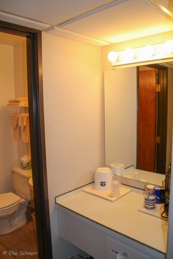 Das Frühstück war ganz ok - typisch mit Eiern und Würstchen, Waffeln, Joghurt, süßen Teilchen, Kaffee und Saft, Bagels, Toast und Cereals. Der Frühstücksraum war im Vergleich zu sonstigen Motels echt nett eingerichtet mit Blümchen auf dem Tisch und einfach einem netten Ambiente.