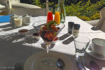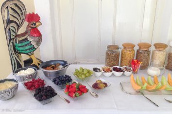 Das Frühstück wurde auf der sonnigen Veranda mit Blick auf den wundervollen Garten serviert und es gab eine riesige Auswahl an Müsli, Obst, Käse, Wurst, Muffins, Brot und Eiern!