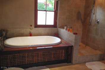 Wir waren im Cottage neben dem Haupthaus untergebracht, das keinerlei Wünsche offen ließ - angefangen mit der geschmackvollen Einrichtung, einem sehr großen und komfortablen Badezimmer, bis zum Kühlschrank, der schon gekühlte, kostenlose Getränke für uns bereithielt.